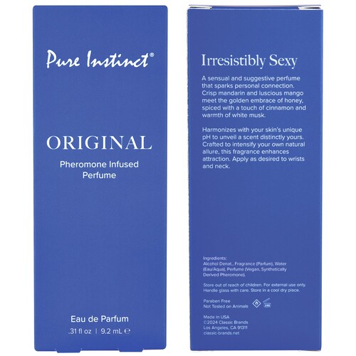 Dating is harder than ever these days, which is why you need a secret advantage like Pure Instinct! This alluring perfume is enriched with pheromones – nature’s way of saying “I’m hot and sexy and ready to play.” They combine with your natural body chemistry to make you appear more interesting to potential partners and increase your primal sex appeal. With its fruity orange & mango and spicy cinnamon scent, this perfume makes an alluring addition to your plans for date night… and after! 0.31 fl. oz., enough for dozens of spritzes. Made in the United States. Vegan-friendly.